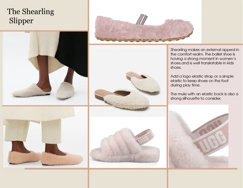 This women’s work from home trend is my absolute favorite. Inspired by this brand, and this one. I love the cozy on top, fashionable, and playful. It’s also great for everyday. Don’t recommend shearling on the inside for warmer cities. This trend fits nicely as a Maryjane. Add an elastic strap with logo, or a buckle with an elastic on the medial side, and you’ve covered your ballet trend as well!